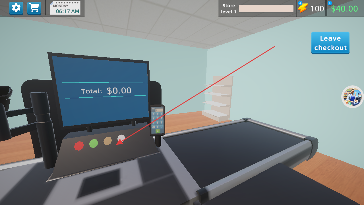 2、在商店外等待開門,進(jìn)入后操作收銀臺(tái)等設(shè)備,完成購物、收銀等打工流程。
