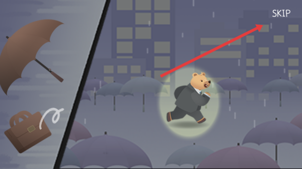 1、劇情頁(yè)點(diǎn)擊【SKIP】跳過(guò)動(dòng)畫(huà),快速進(jìn)入游戲,操控小熊,開(kāi)啟都市到鄉(xiāng)村的釣魚(yú)冒險(xiǎn)之旅。