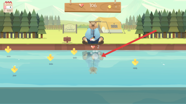 2、在釣魚(yú)場(chǎng)景,長(zhǎng)按箭頭指向的水面區(qū)域,讓小熊拋竿,等待魚(yú)咬鉤,完成釣魚(yú)互動(dòng),收集資源。
