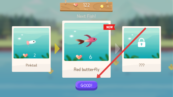 3、釣到新魚(yú)(如Red-butterfly)后,點(diǎn)擊【GOOD!】確認(rèn),解鎖魚(yú)類圖鑒,積累收集進(jìn)度,提升成就。