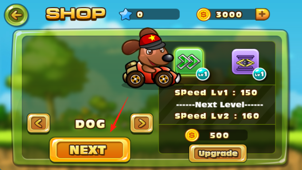 2、觸摸開(kāi)始后選叢林賽道,進(jìn)入商店通過(guò)“NEXT”切換賽車(chē),駕駛參賽爭(zhēng)取勝利。