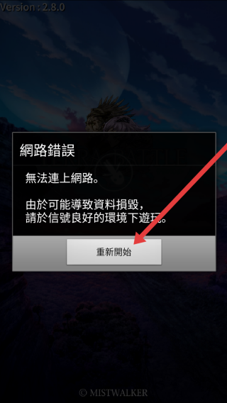 3、若彈出“網(wǎng)路錯誤”提示(說明無法連網(wǎng)且可能損毀數(shù)據(jù)),點擊【重新開始】按鈕,在穩(wěn)定網(wǎng)絡(luò)下重試以正常進入游戲。