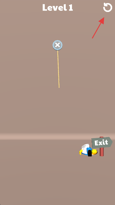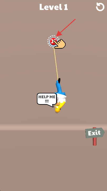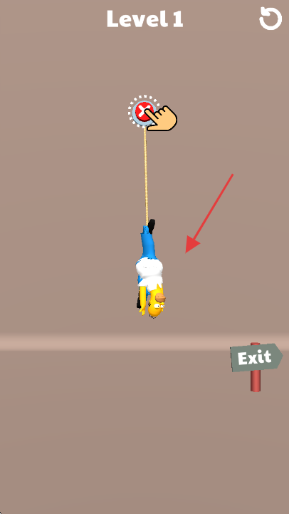 1、游戲第一關(guān),角色倒掛在繩子上,目標(biāo)是讓角色到達(dá)【Exit】處,需操作解開繩子。
