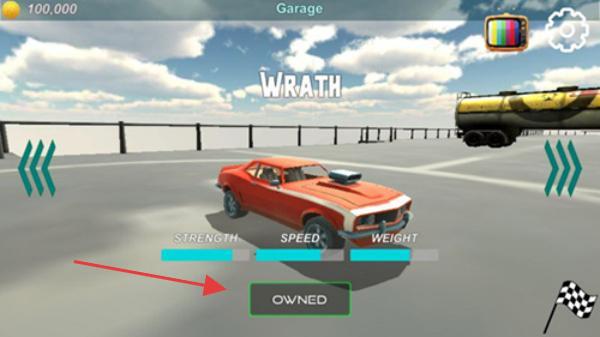 1、競(jìng)技場(chǎng)開(kāi)局,選“WRATH”橙色車(已擁有),看屬性(力量、速度、重量)適配撞車玩法,駕駛紅白車(或其他),優(yōu)先撞敵方黃車、工程車。