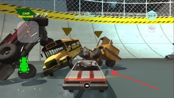 2、車庫(kù)確認(rèn)“OWNED”車輛,按需改裝(提升力量/速度),再進(jìn)競(jìng)技場(chǎng),利用車輛屬性,撞翻敵方(如黃出租車、校車),減少“CAR REMAINS”數(shù)量。
