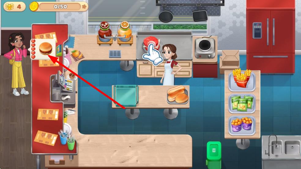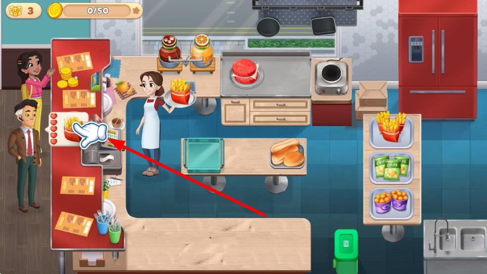 2、在廚房區(qū)域,按提示操作,使用相應(yīng)食材和廚具制作菜品,完成后交付給顧客,獲取金幣和經(jīng)驗值。
