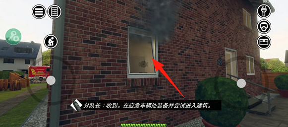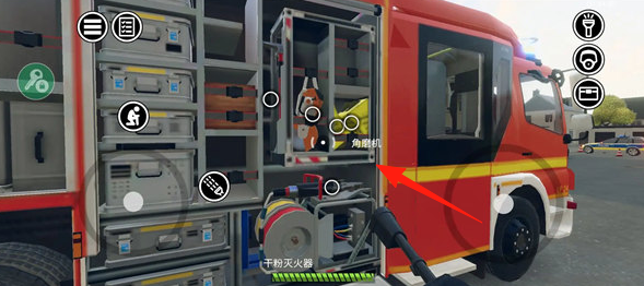 2、來到消防車處,按【箭頭】指引,從車上拿取干粉滅火器等裝備。