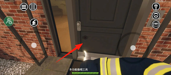 3、到達(dá)建筑門前,用【箭頭】所指多功能破拆工具,破門進(jìn)入,開展滅火救援。