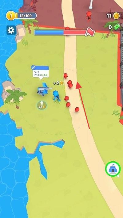 2、規(guī)劃防御路徑,利用兵種(士兵、炮臺(tái))特性,阻攔紅色敵人沿路徑進(jìn)攻,守護(hù)旗幟。
