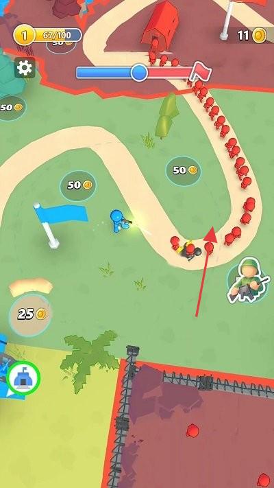 1、操控藍(lán)色火柴人采集金幣(地面金堆),積累資源,點(diǎn)擊建造按鈕(炮臺(tái)、士兵)布置防御。