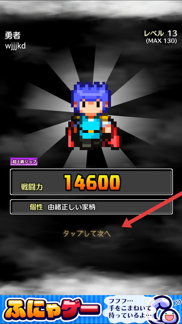3、角色界面顯示職業(yè)【勇者】、等級13、戰(zhàn)斗力14600及個性【由緒正しい家柄】,點擊【タップして次へ】,進入游戲流程。
