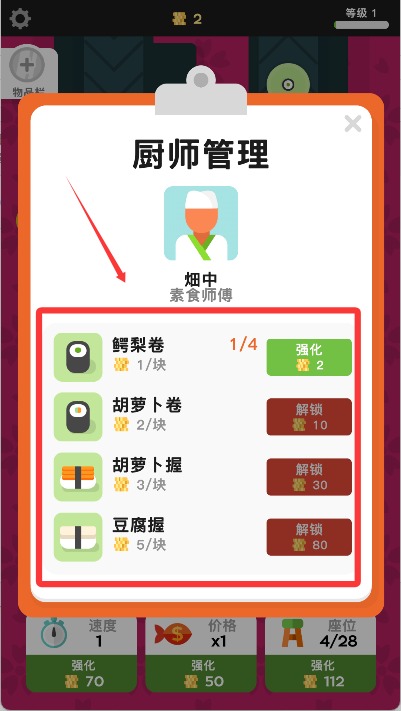 1、知名主廚解鎖與升級體系,觸及壽司界頂尖大師,通過提高廚師技能等級解鎖全新菜譜,讓餐廳實力快速提升。