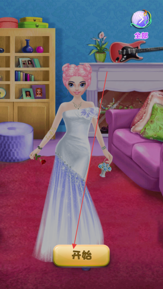 1、點(diǎn)擊“開(kāi)始”進(jìn)入游戲,可先為公主選擇服飾(如禮服、配飾),搭配造型。