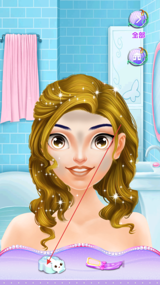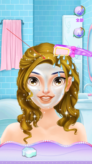 2、切換到美容場(chǎng)景,點(diǎn)擊洗浴用品(如卡通造型肥皂),為公主清潔、護(hù)理頭發(fā)皮膚。