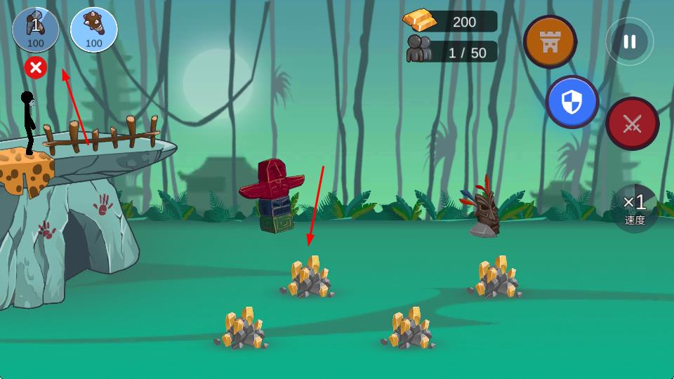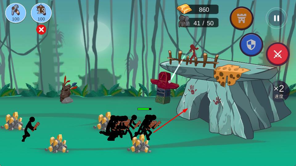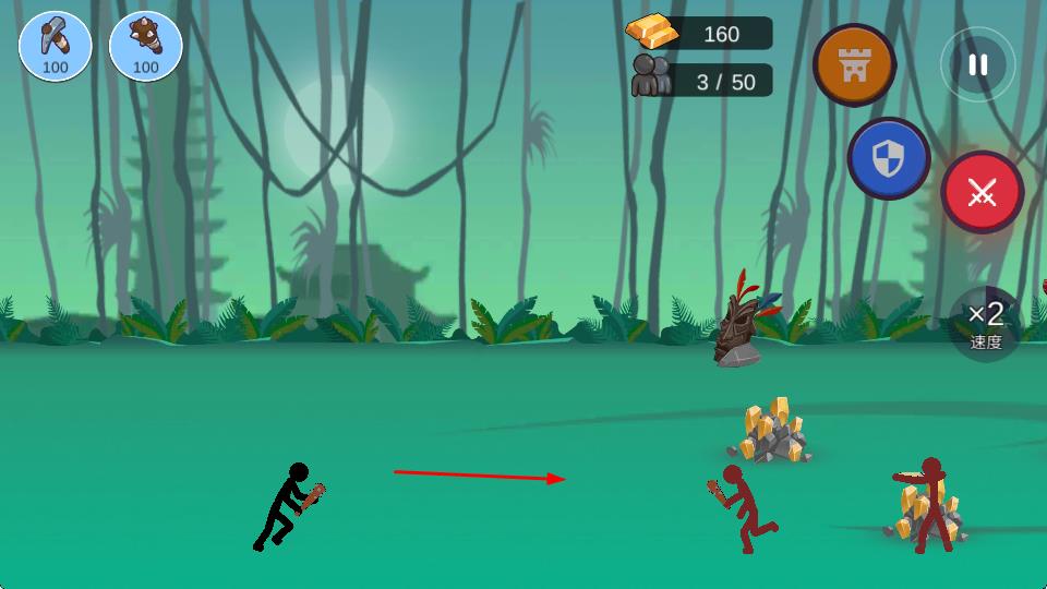 3、指揮戰(zhàn)斗火柴人部隊,主動出擊,進攻敵方建筑(洞穴等),擊敗敵方單位,獲取戰(zhàn)斗勝利。