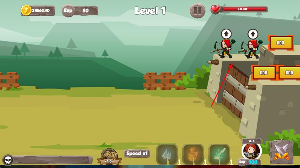 1、進入Level1等關(guān)卡,點擊“ADD”布置弓箭手到防御位,利用金幣、經(jīng)驗升級強化。