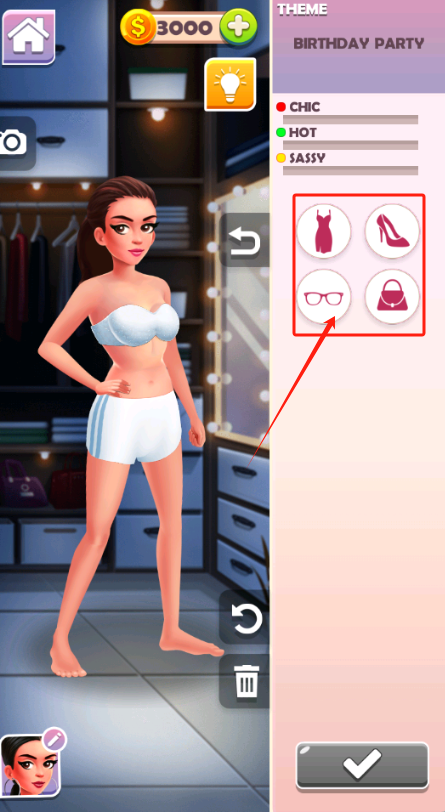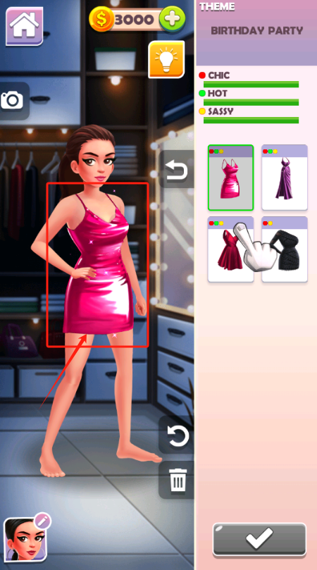 1、選生日派對主題,點(diǎn)裙子圖標(biāo)換粉色吊帶裙,錢夠3000就點(diǎn)確認(rèn)按鈕。