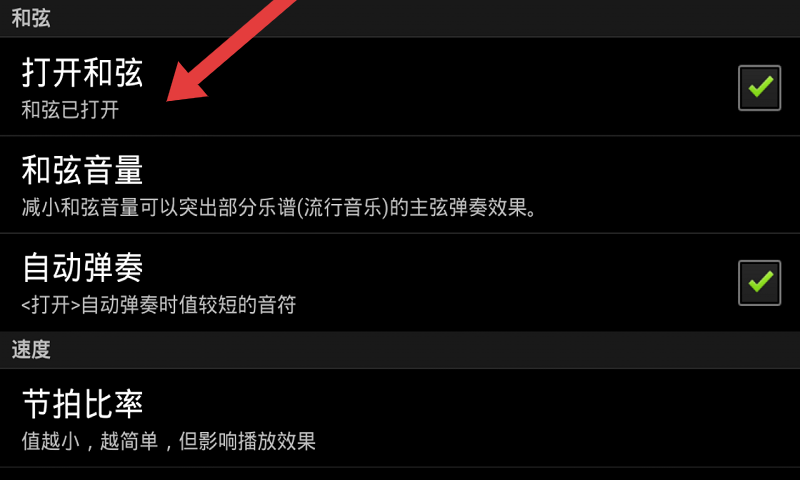 2、若需調(diào)整演奏設(shè)置,進入【SETTING】界面,可開啟和弦、調(diào)節(jié)音量或啟用自動彈奏功能,優(yōu)化演奏效果。