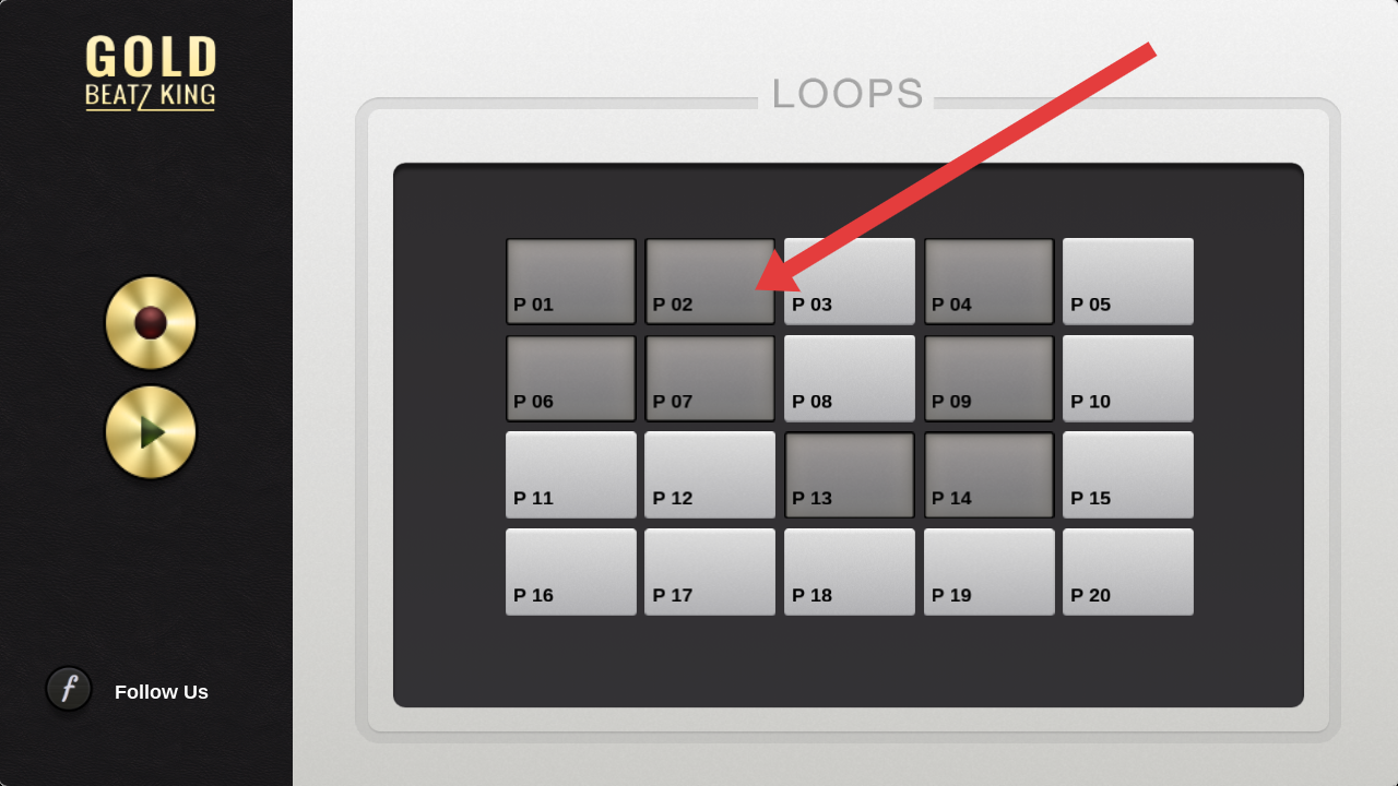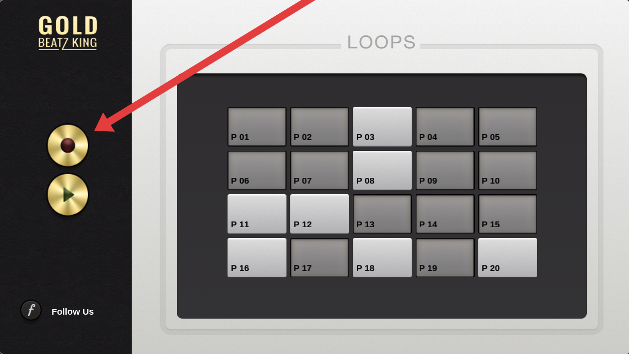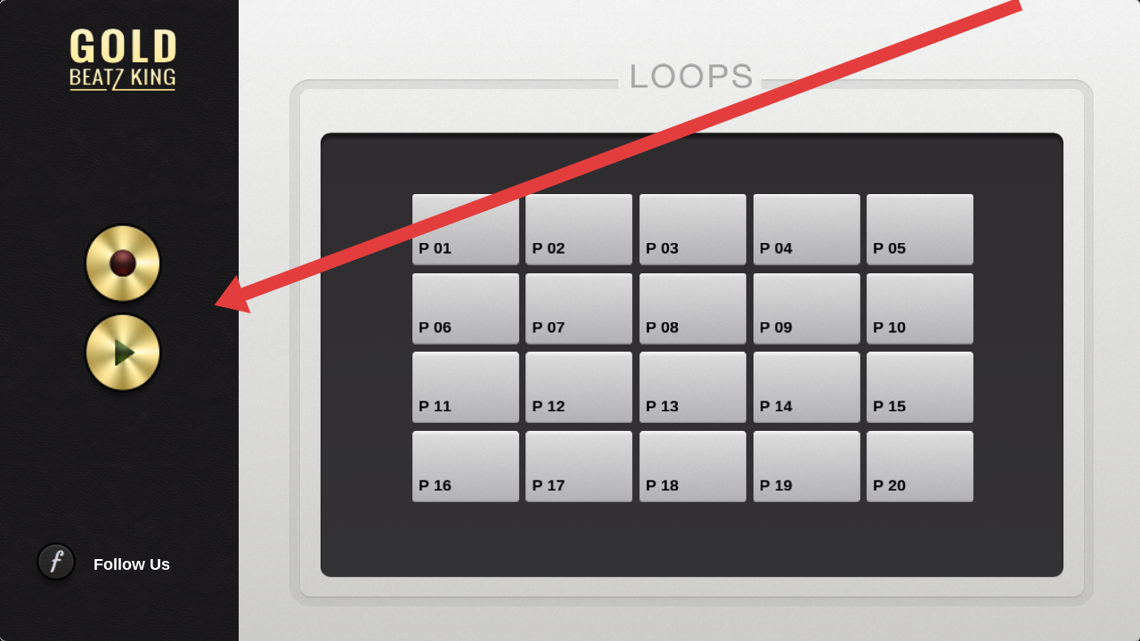 1、進(jìn)入曲目列表界面,左側(cè)金色按鈕中,紅色為錄制鍵、綠色為播放鍵,點(diǎn)擊P01-P20任意曲目方塊,開始節(jié)奏循環(huán)創(chuàng)作。