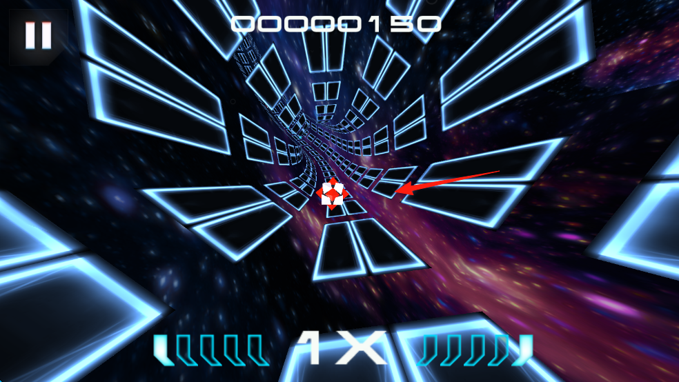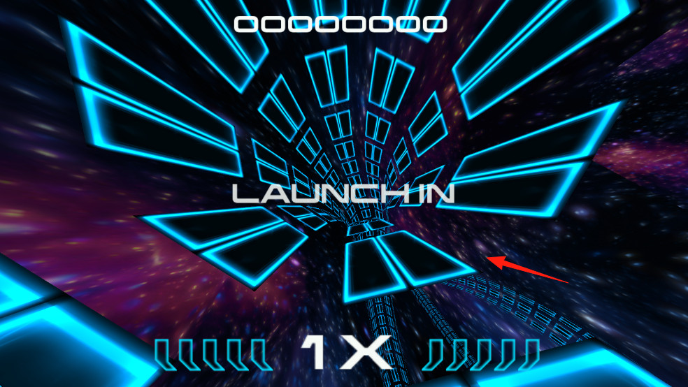 2、進入加載完成的隧道場景后,留意頂部倒計時數(shù)字與“1X”倍數(shù)標識,飛船會以當前速度自動前進,此時要觀察隧道內(nèi)壁藍色光塊的排列變化。