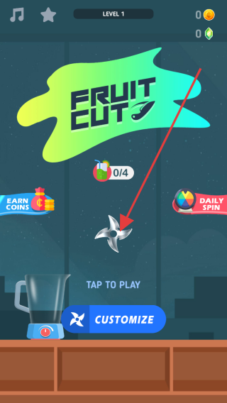 1、打開游戲FRUITCUT,按箭頭指示點擊屏幕中間的旋轉刀具,進入游戲關卡。