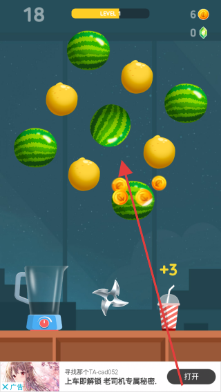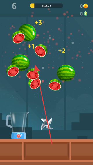 2、進入關卡后,依照箭頭方向,滑動屏幕操控刀具切割飛來的水果(如西瓜),獲取分數(如+1、+2、+3)。