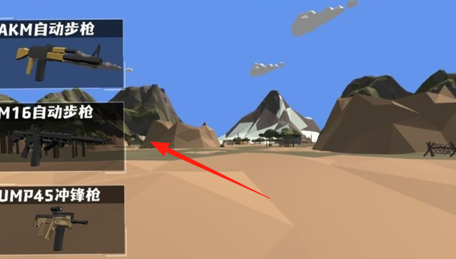 1、武器選擇在武器界面,按箭頭指引,可選AKM、M16自動(dòng)步槍、UMP45沖鋒槍,點(diǎn)擊對(duì)應(yīng)武器準(zhǔn)備戰(zhàn)斗。