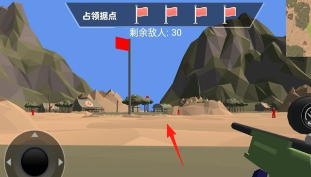 2、據(jù)點(diǎn)占領(lǐng)進(jìn)入沙漠場(chǎng)景,按箭頭方向,移動(dòng)角色(通過(guò)左側(cè)搖桿),占領(lǐng)據(jù)點(diǎn),消滅剩余敵人(30個(gè))。