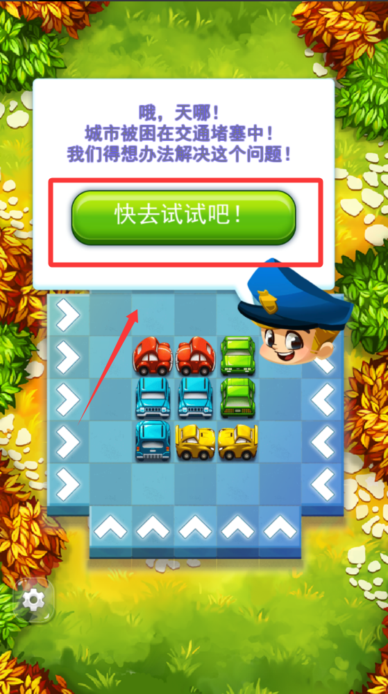 1、哇,堵塞交通哦,快點(diǎn)擊下面的綠色按鈕試一試疏通一下車輛。