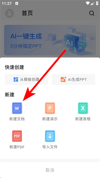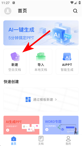 2、在彈出的快速創(chuàng)建選項中選擇新建文檔,進入編輯界面。