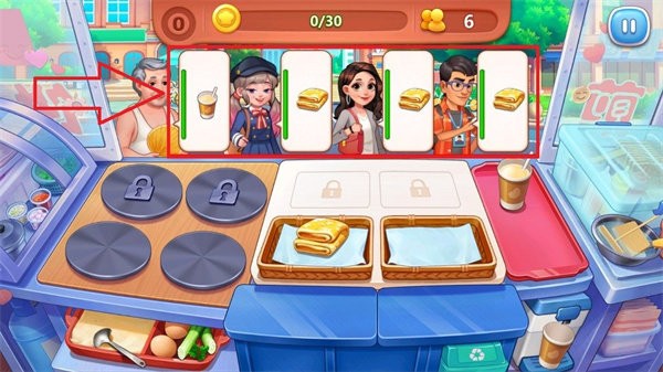 2、解鎖新烹飪位(箭頭指向),擴(kuò)大制作產(chǎn)能,同時(shí)按顧客順序,優(yōu)先處理需求簡單、等待久的訂單,提升效率。