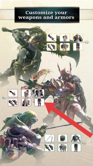2、文字“定制你的武器和盔甲”,畫面展示了不同造型的獵人角色以及可選擇搭配的武器、盔甲等裝備,強調裝備自定義玩法。
