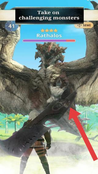 3、文字“挑戰(zhàn)具有挑戰(zhàn)性的怪物”,畫面中顯示獵人正準備挑戰(zhàn)一只名為Rathalos(雄火龍)的怪物,左上角顯示數字“41”,右上角有“SEMI”字樣,與進度或難度相關。