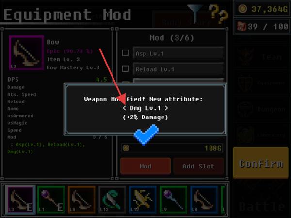 1、“改裝裝備”,在“EquipmentMod”界面,消耗金幣(108G),為武器(Bow)添加屬性(DmgLv.1)。