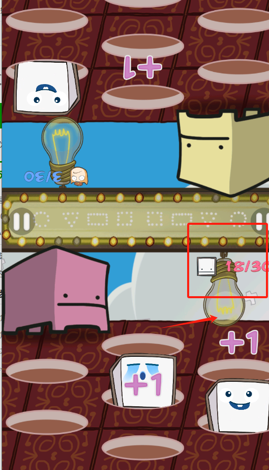 3、看藍色區(qū)域的燈泡小人,點擊發(fā)射方塊角色,目標是填滿18/30的槽位獲勝。
