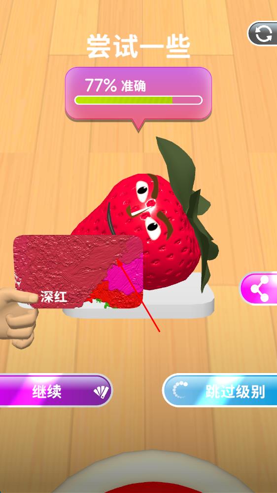 2、調(diào)色過程中,根據(jù)顏色差異調(diào)整顏料比例,逐步接近目標色,完成后將顏色應(yīng)用到圖案上,通過關(guān)卡檢驗進入下一挑戰(zhàn)。