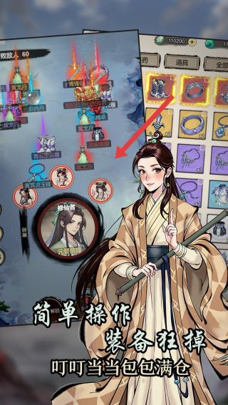 2、在戰(zhàn)斗或任務(wù)后,收獲大量裝備道具,進(jìn)入背包界面,瀏覽琳瑯滿目的物品,挑選適配自身修仙階段的裝備穿戴,提升角色屬性,用于強(qiáng)化核心裝備,讓角色戰(zhàn)力飆升。