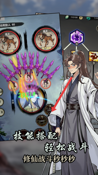 3、進(jìn)入戰(zhàn)斗技能配置環(huán)節(jié),從技能庫(kù)中挑選多樣技能,像紫色劍陣這類強(qiáng)力技能,搭配出戰(zhàn),戰(zhàn)斗時(shí),依據(jù)敵方陣容(如惡犬等),輕松擊潰敵人,體驗(yàn)修仙戰(zhàn)斗的策略與爽感。