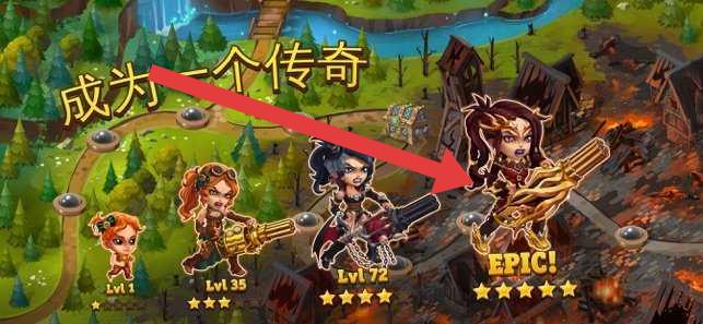 1、英雄選擇界面,點(diǎn)擊箭頭指向的“EPIC!”英雄(最高星級(jí)),查看其屬性、技能,決定是否培養(yǎng),助力“成為一個(gè)傳奇”目標(biāo)。