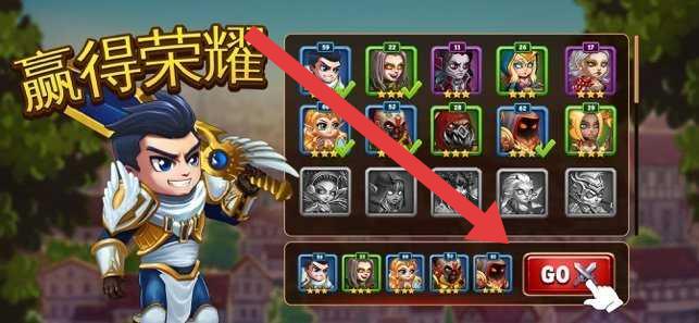 2、陣容界面,選中箭頭指向的英雄,點(diǎn)擊“GO”,帶領(lǐng)隊(duì)伍參與戰(zhàn)斗,“贏得榮耀”,獲取獎(jiǎng)勵(lì)提升戰(zhàn)力。