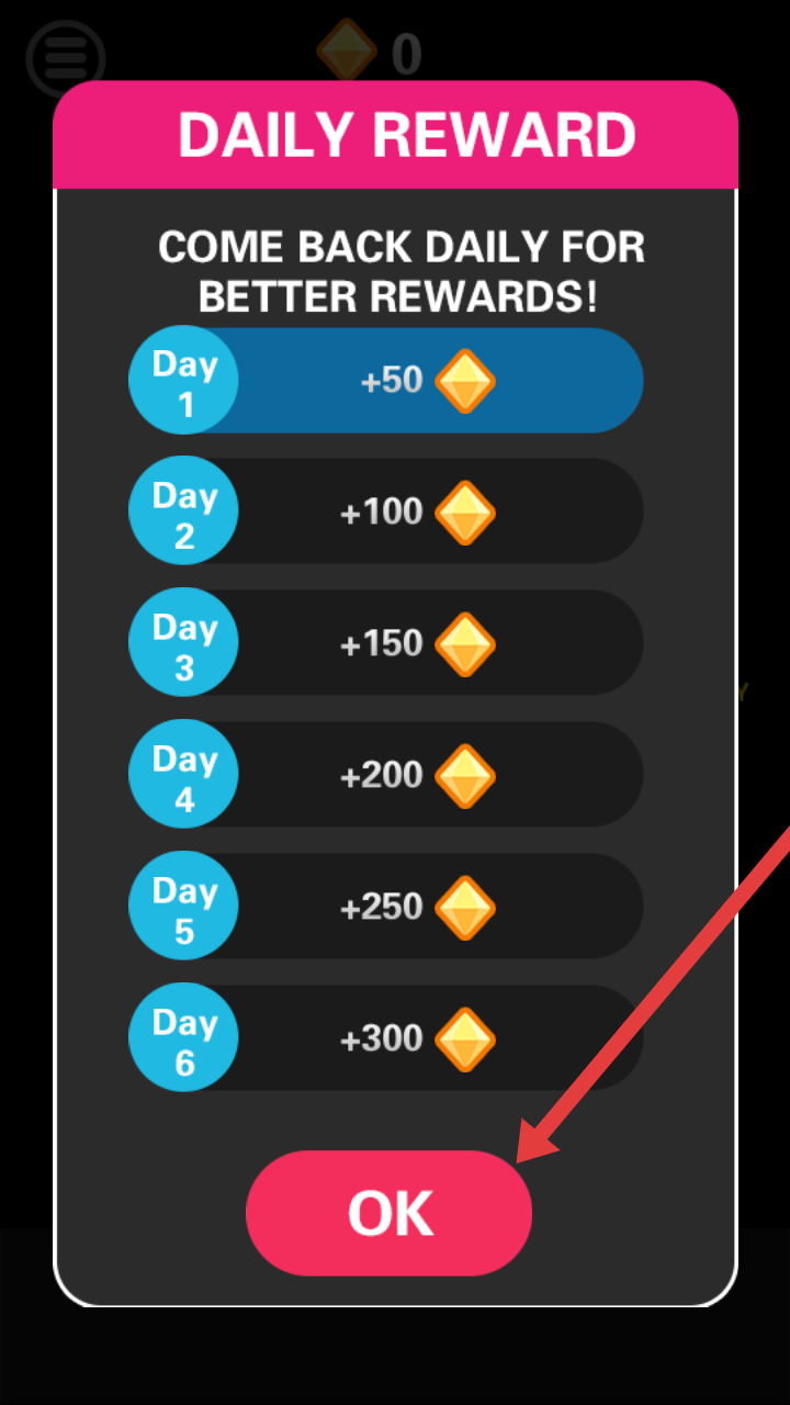 1、進(jìn)入每日獎勵界面,查看【DAILY REWARD】規(guī)則,每日登錄可領(lǐng)鉆石,點擊下方【OK】按鈕確認(rèn)領(lǐng)取。