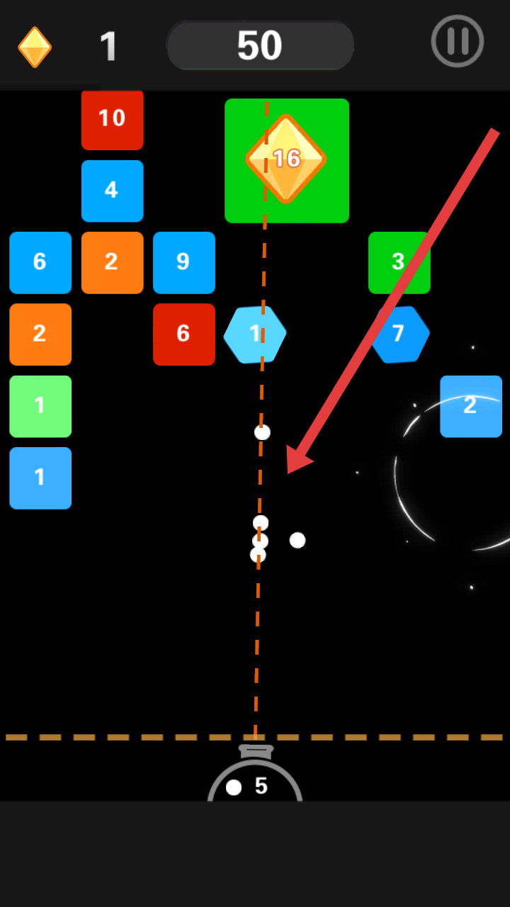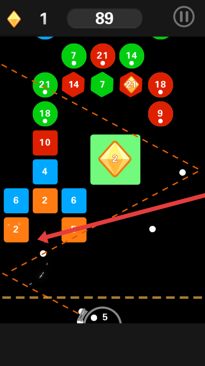 3、利用小球反彈機制,規(guī)劃橙色虛線軌跡,讓小球撞擊箭頭指向的橙色方塊(數(shù)字2)等,通過反彈消除更多磚塊,沖擊更高分?jǐn)?shù)。