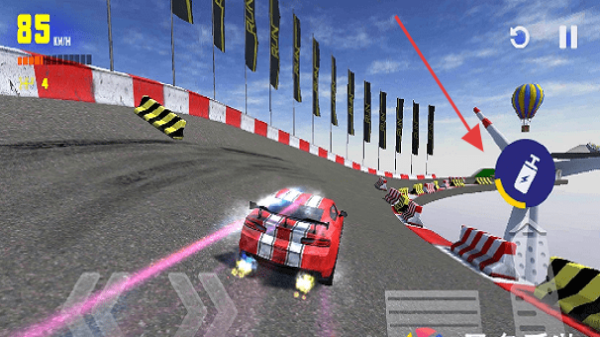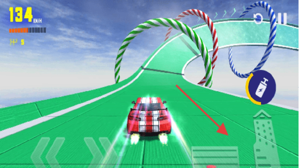 1、駕駛賽車沖綠色螺旋賽道,留意右側(cè)技能圖標,遇彎道、坡道合理用加速,保持高速過障礙。
