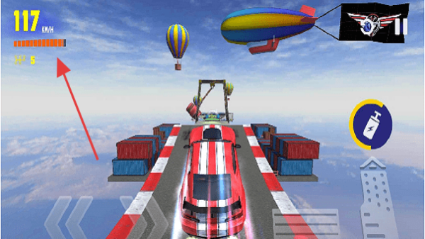 2、在高空賽道,關(guān)注左上角速度、狀態(tài),避集裝箱,借加速沖跳臺,利用浮空段調(diào)整,穩(wěn)落地。