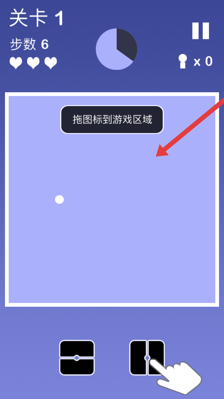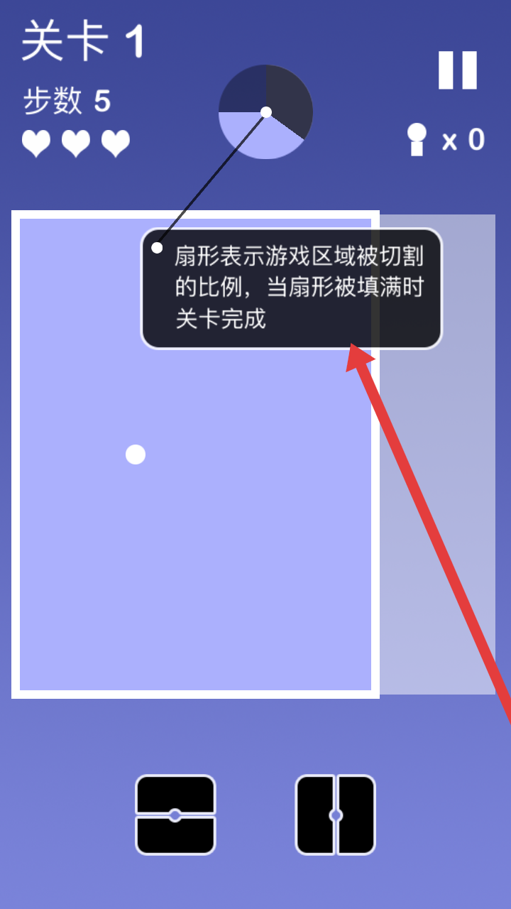 3、關(guān)注上方扇形進(jìn)度,其代表游戲區(qū)域切割比例,通過放置圖標(biāo)填滿扇形,達(dá)成關(guān)卡1的通關(guān)條件。