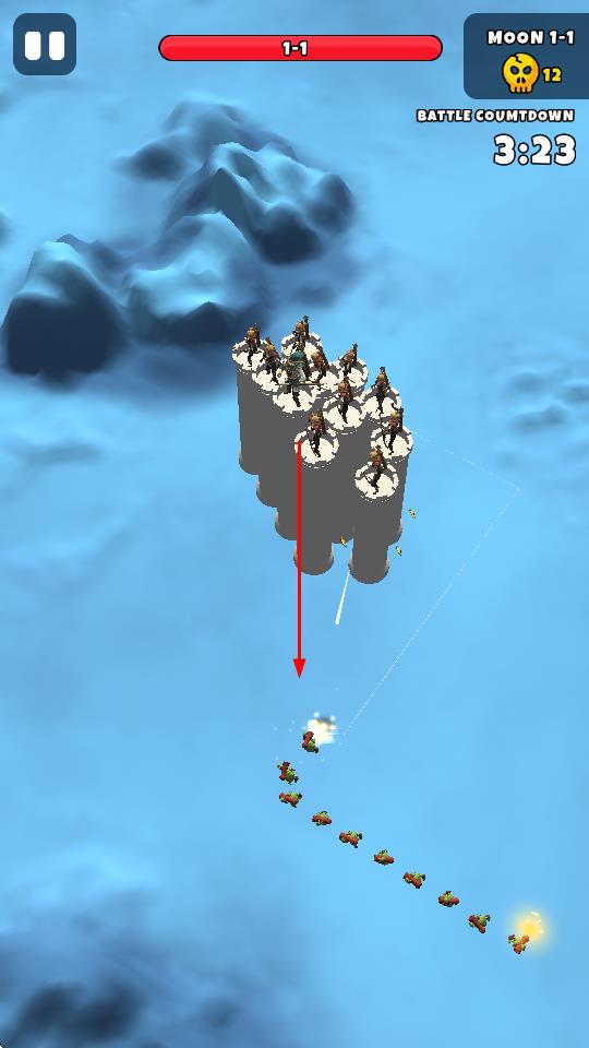 3、“防御戰(zhàn)斗”,在關(guān)卡(1-1)中,士兵自動(dòng)攻擊來襲敵人,堅(jiān)守塔樓,完成波次防御。