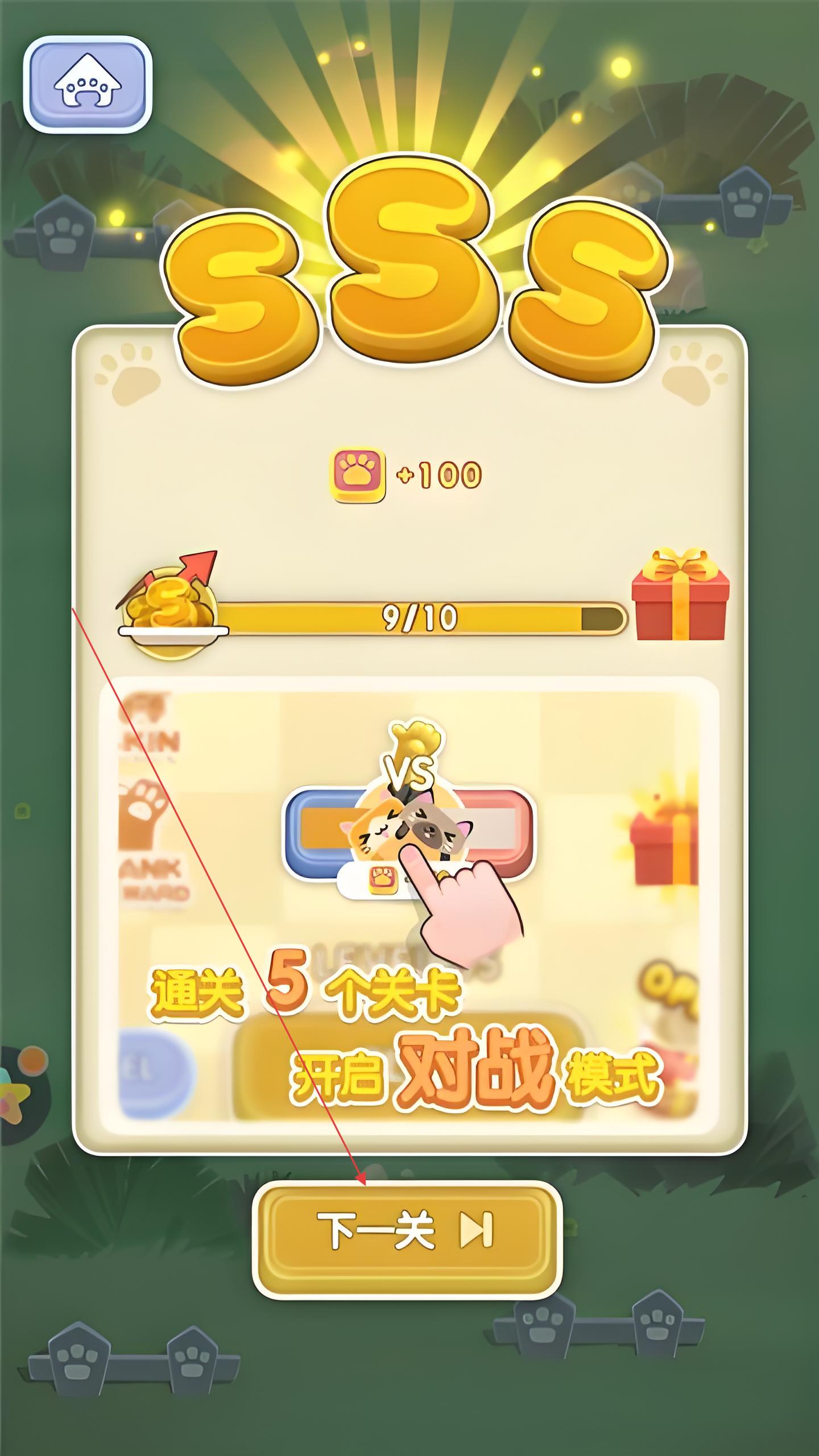 3、萌系畫面風(fēng)格:采用卡通畫風(fēng)打造可愛的貓貓角色與清新的方格場(chǎng)景,搭配柔和的色彩與流暢的動(dòng)畫效果,營(yíng)造治愈的游戲氛圍。