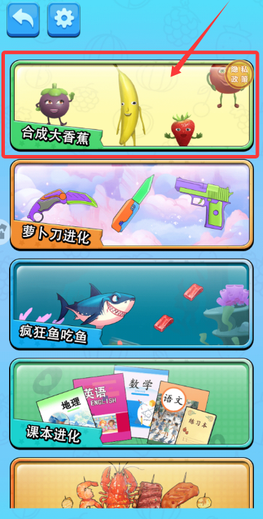 2、在選擇界面從香蕉大合成、蘿卜刀進(jìn)化等玩法模式中,優(yōu)先體驗趣味十足的香蕉合成挑戰(zhàn)。