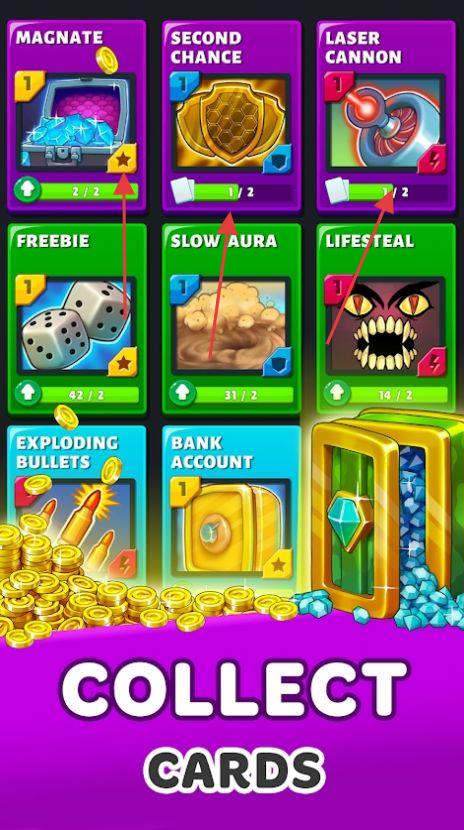 2、“收集卡牌”,獲取如MAGNATE、LASERCANNON等卡牌,升級解鎖技能,輔助戰(zhàn)斗。