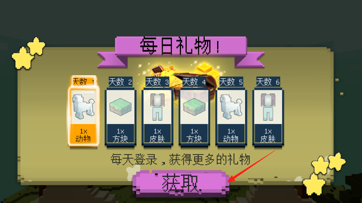 3、進入每日禮物頁面,查看按天數(shù)排列的獎勵內(nèi)容,涵蓋動物、方塊、皮膚等不同類型,每天登錄游戲后,點擊“獲取”,領取對應天數(shù)的獎勵。